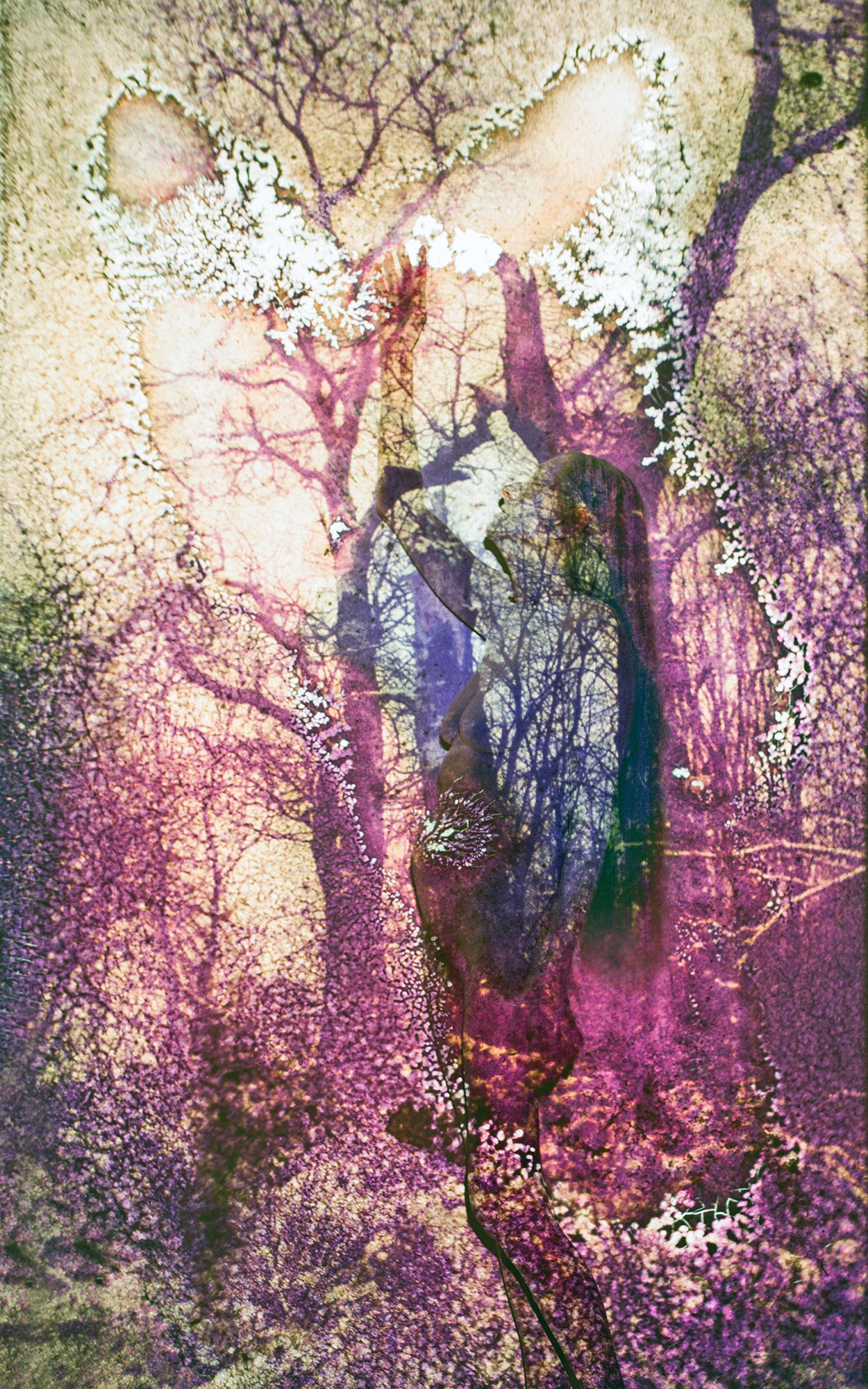 The slides of plants, trees and shrubs projected in the images, whose positives have been exposed to the processes of mold growth for years, create the simultaneous presence of a past of growth and a future of decay. They inscribe the body with its temporality as a trace of becoming and a state of metamorphosis, merging with its curves and contours, its twists and stretches. Fundamental processes of ageing, withering and flourishing – on closer inspection, everything flows into one another to such an extent that it is almost impossible to distinguish the different levels of the images.